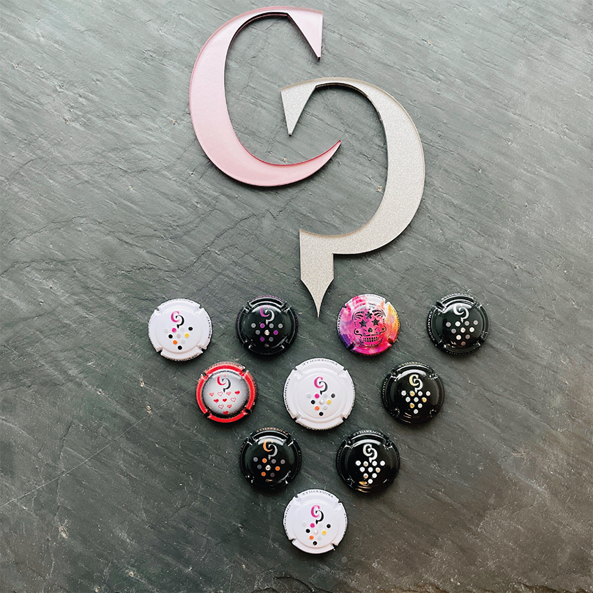 Double embossage, strass posés à la main un à un : chaque muselet devient une pièce de collection.